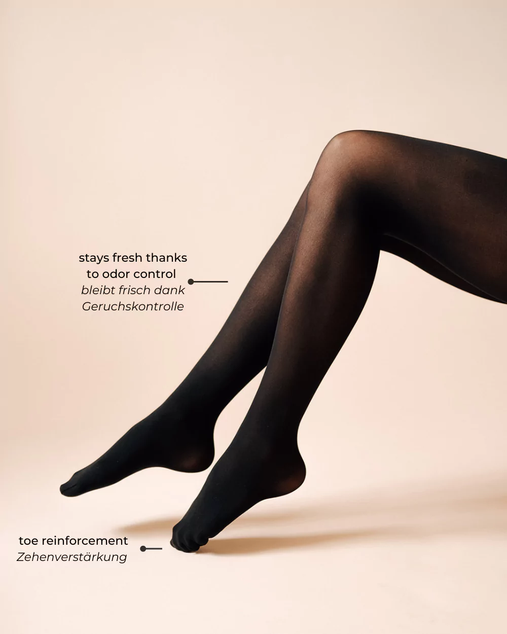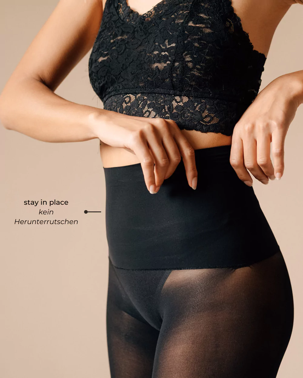 Der formende Bund betont die natürliche Silhouette und dank des Einsatzeinsatzes im Schritt rutscht diese Strumpfhose den ganzen Tag nicht herunter – maximaler Komfort!