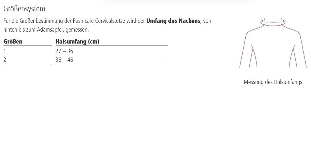 Die Push care Cervicalstütze bietet der Halswirbelsäule guten Halt durch ihre anatomische Passform und den Einsatz eines formfesten Schaumstoffs. Hals und Kopf erhalten zwischen Kiefer und Schlüsselbein funktionellen Halt, werden aber nicht immobilisiert. Die abgerundete Ränder sowie die weiche, Feuchtigkeit ableitende Auskleidung, verleihen der Stütze zusätzlich einen sehr hohen Tragekomfort.