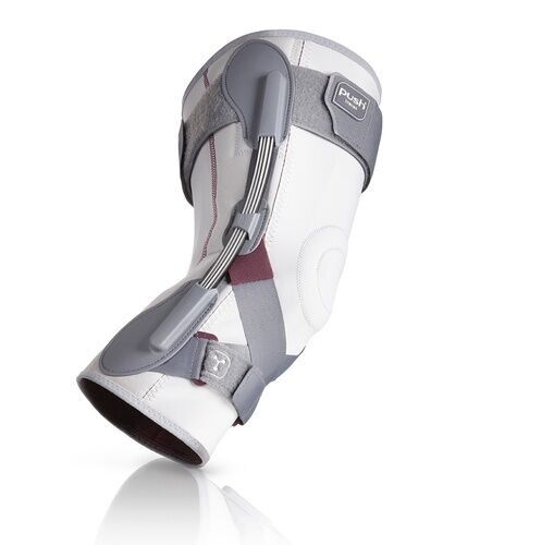 Die Push med Kniebandage bietet dem Kniegelenk starken seitlichen Halt. Zwei Blattfederscharniere folgen dabei auf einzigartige Weise der natürlichen Rotationsbewegung des Knies.
