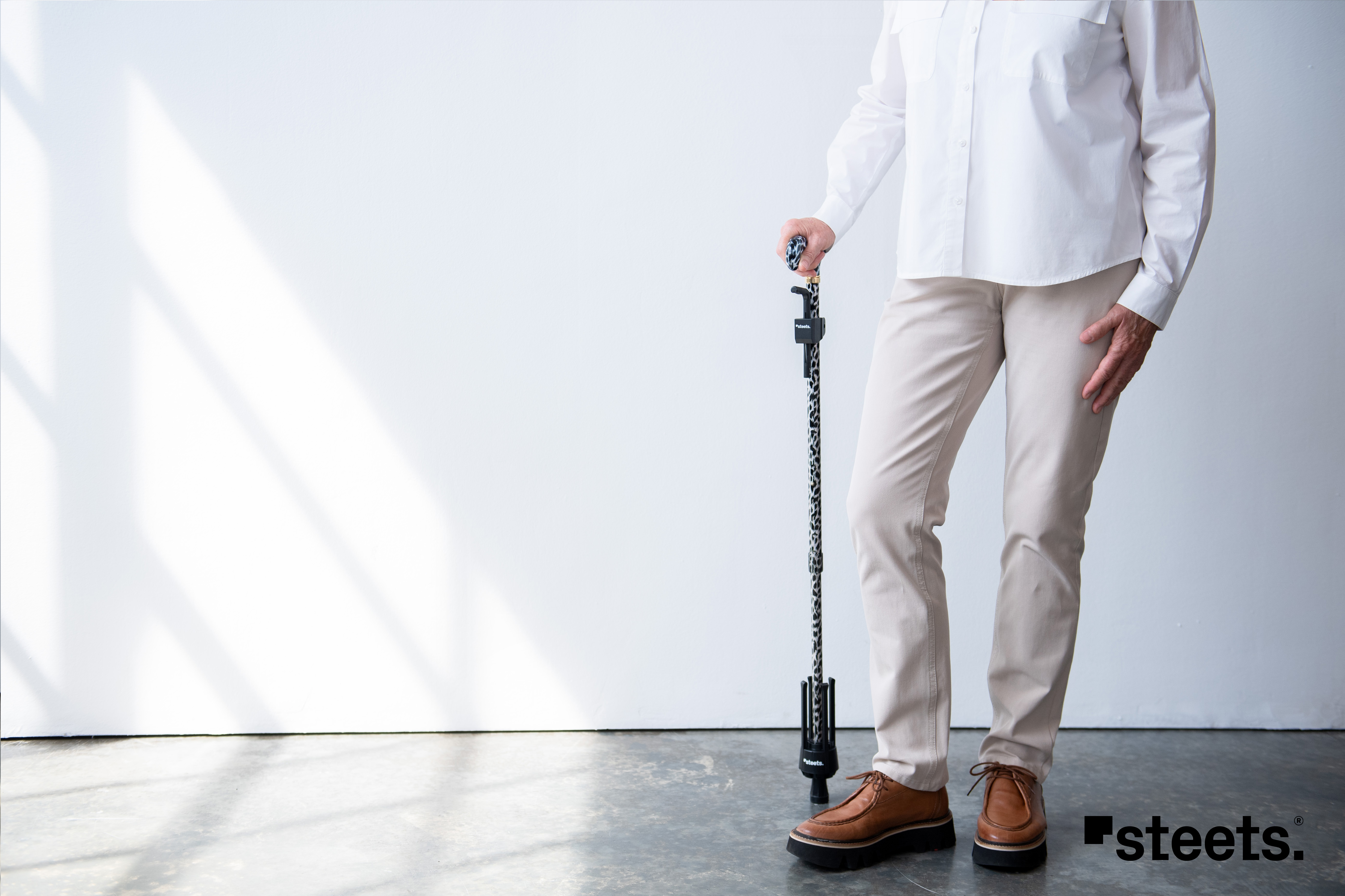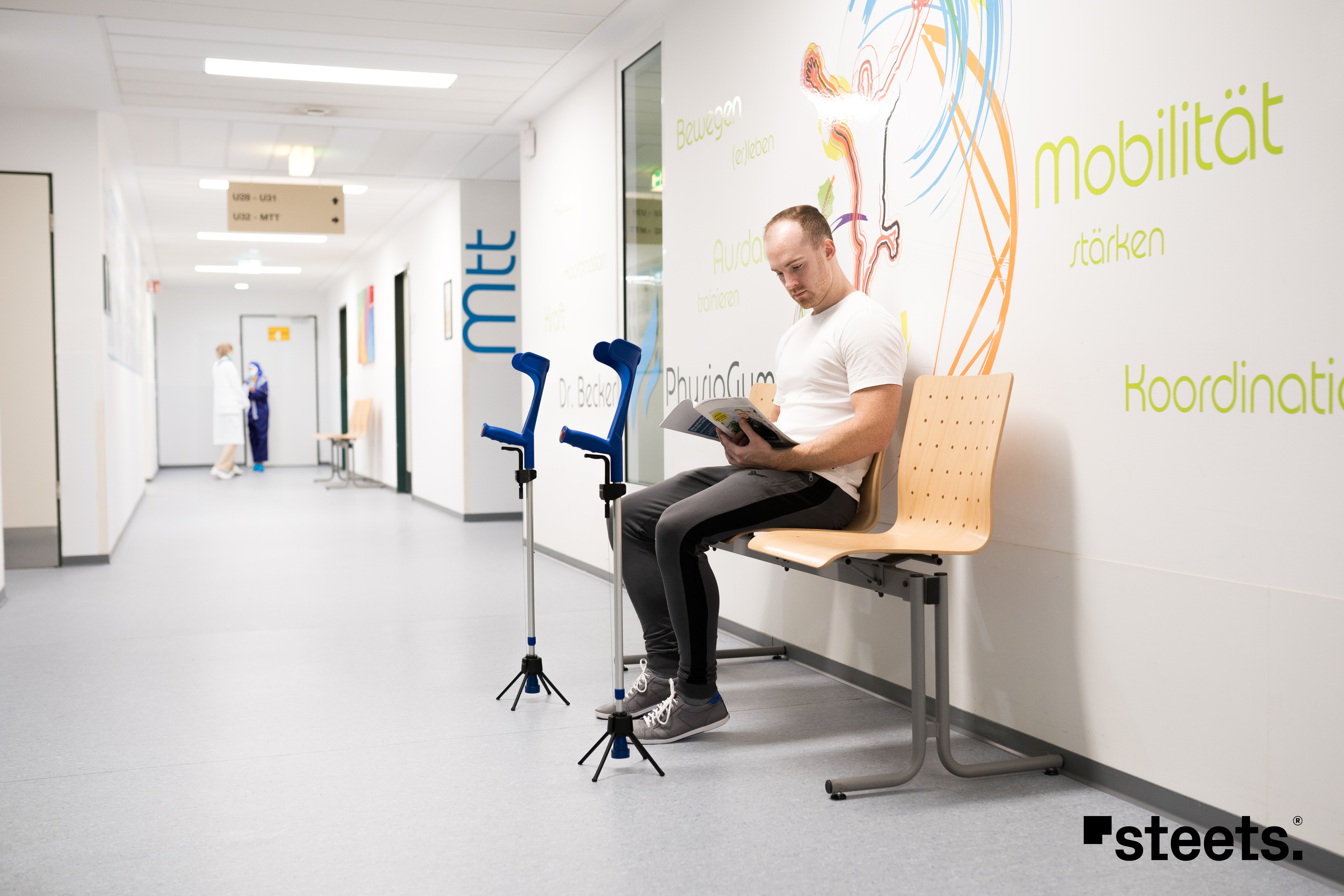 Die STEETS Abstellhilfe erleichtert den Alltag mit Gehstützen spürbar. Mit nur einer Handbewegung lassen sich Unterarmgehstützen oder Gehstöcke sicher im freien Raum abstellen – ohne Anlehnen, ohne Umfallen, stets griffbereit. Das Zusatzmodul wird an bestehende Gehhilfen montiert und macht sie im Handumdrehen zu selbststehenden Begleitern.